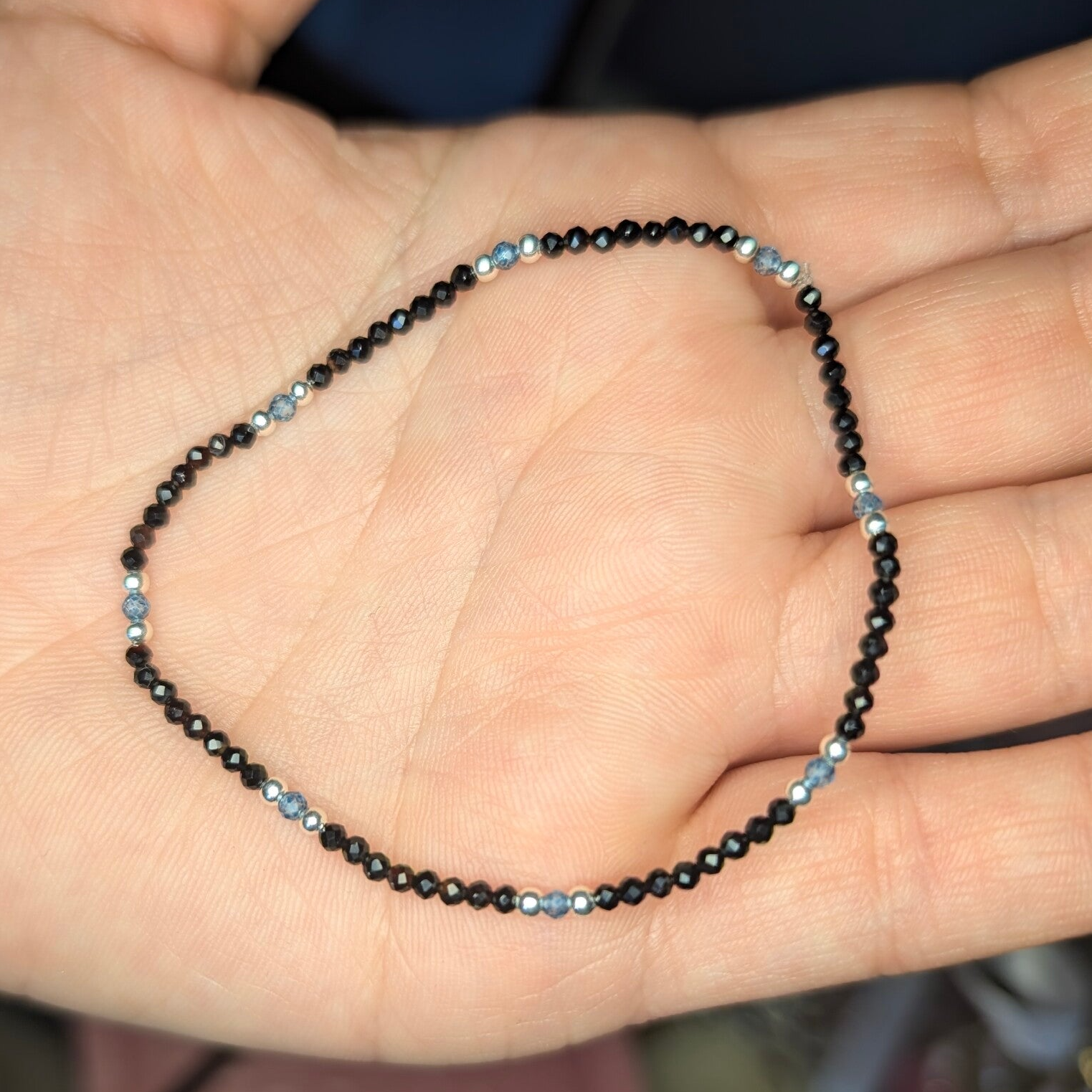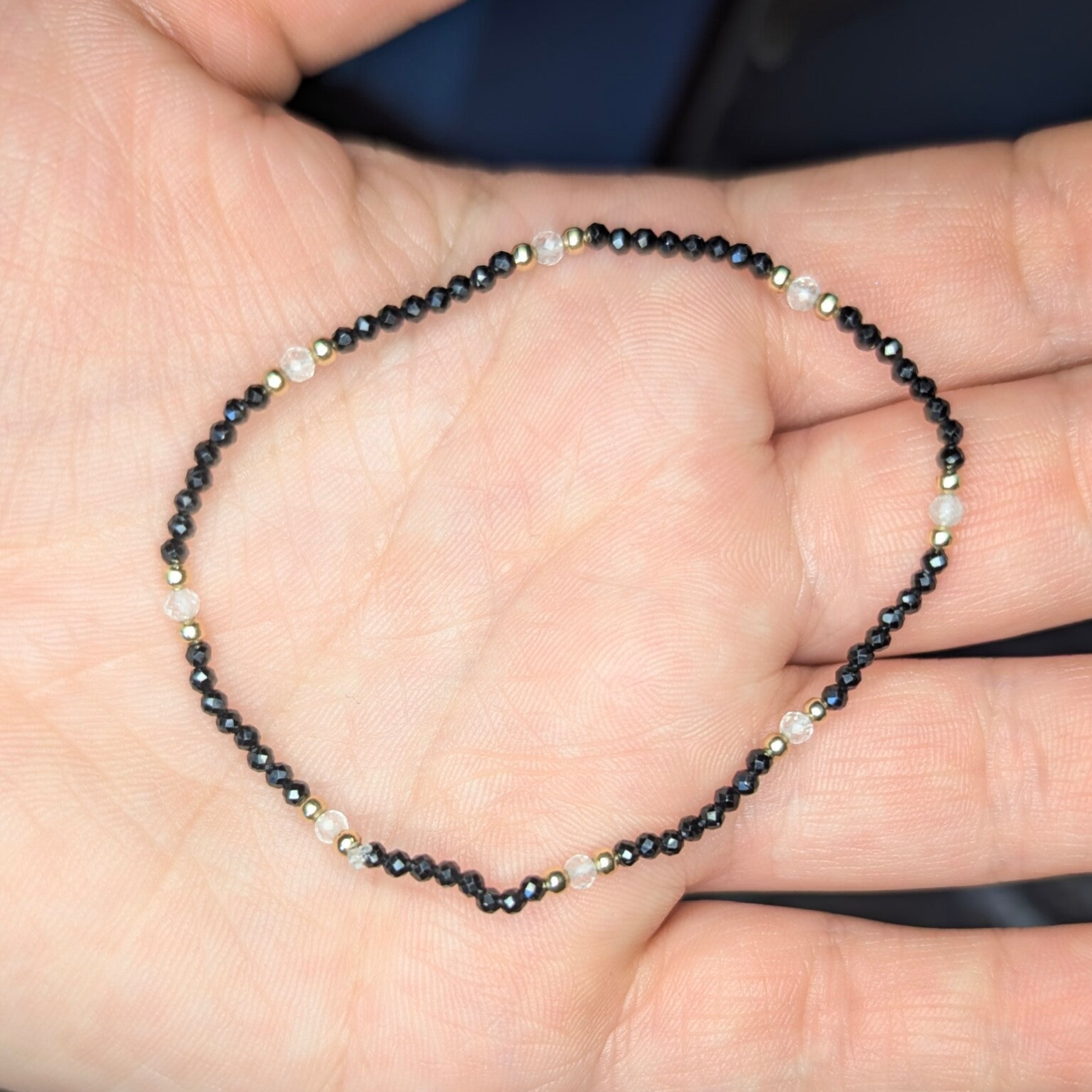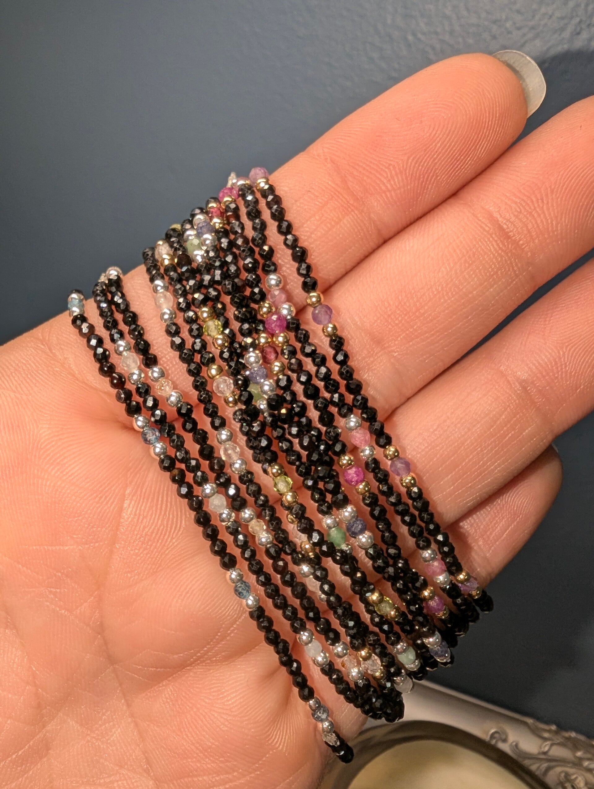 Faceted 2mm AAA Spinel and onyx beads adorned with the birthstones, strung on stretch cord. Available in 14k Gold filled or 925 Sterling Silver.