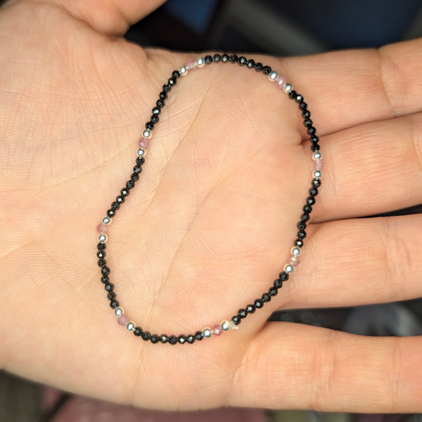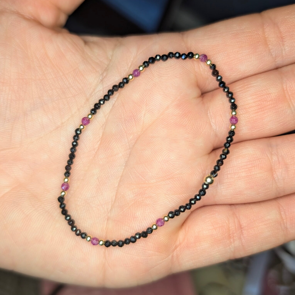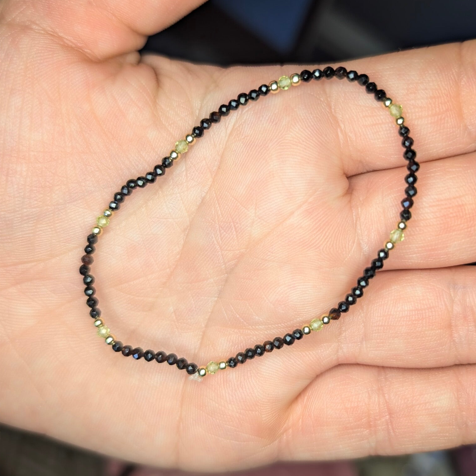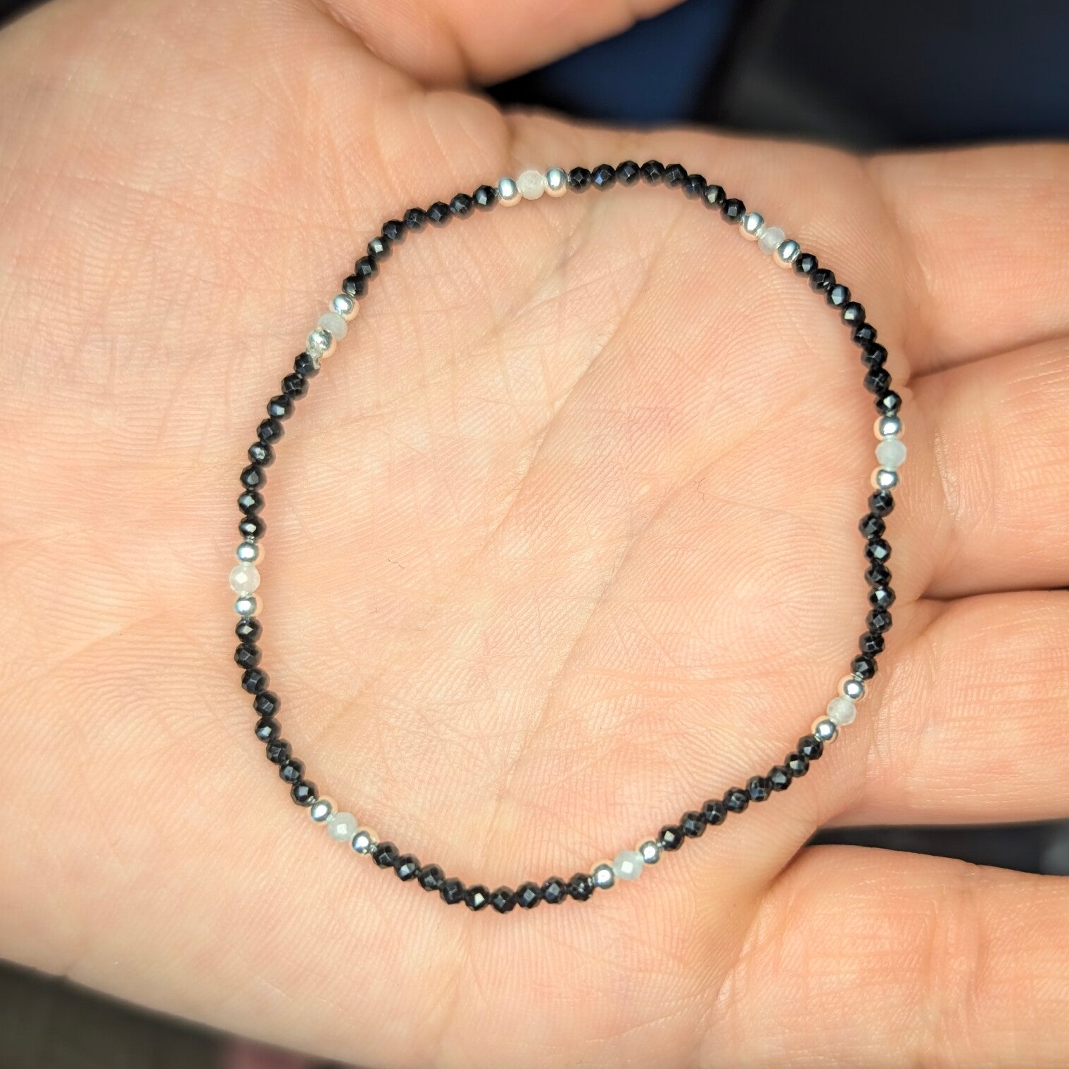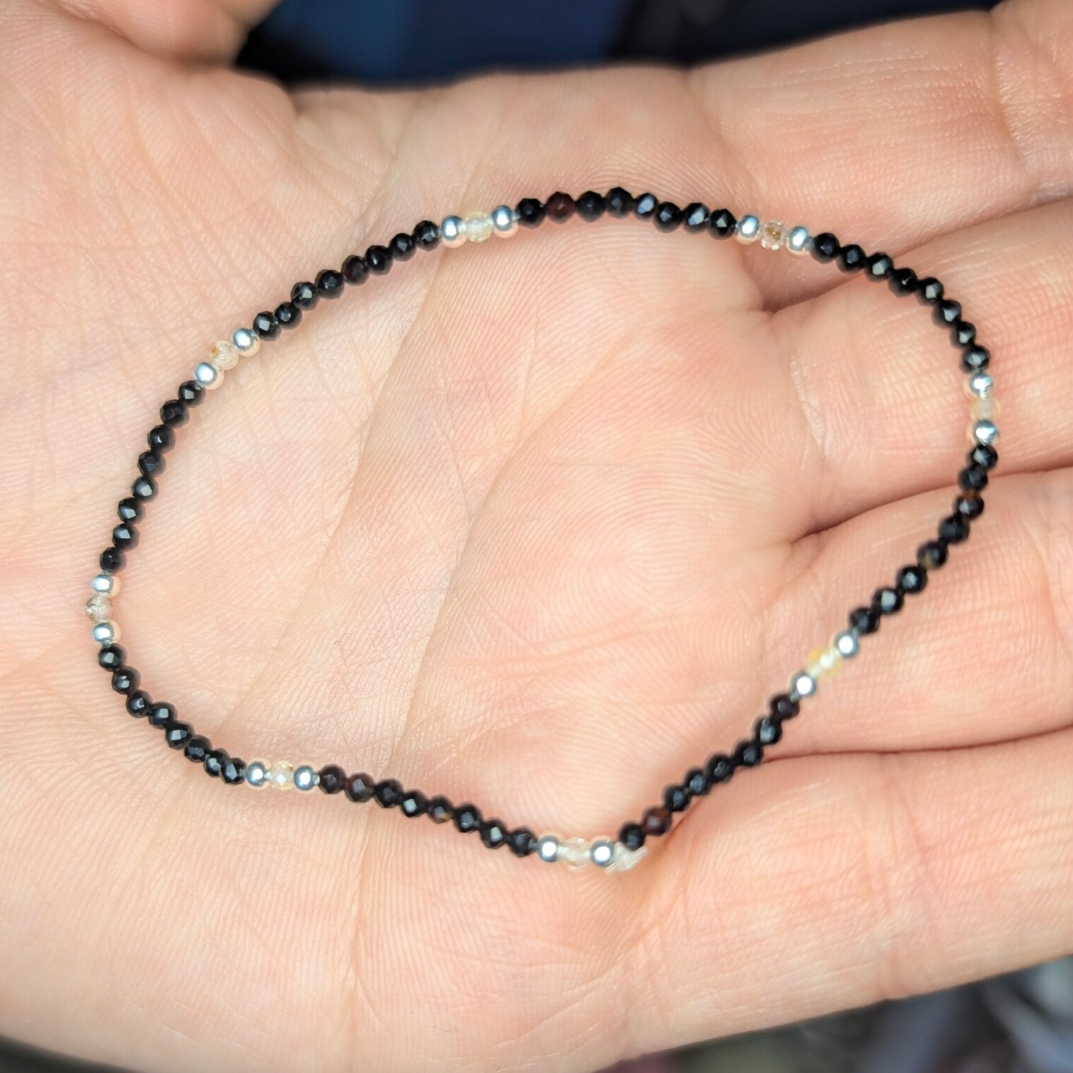Faceted 2mm AAA Spinel and onyx beads adorned with the birthstones, strung on stretch cord. Available in 14k Gold filled or 925 Sterling Silver.