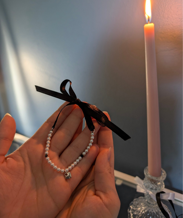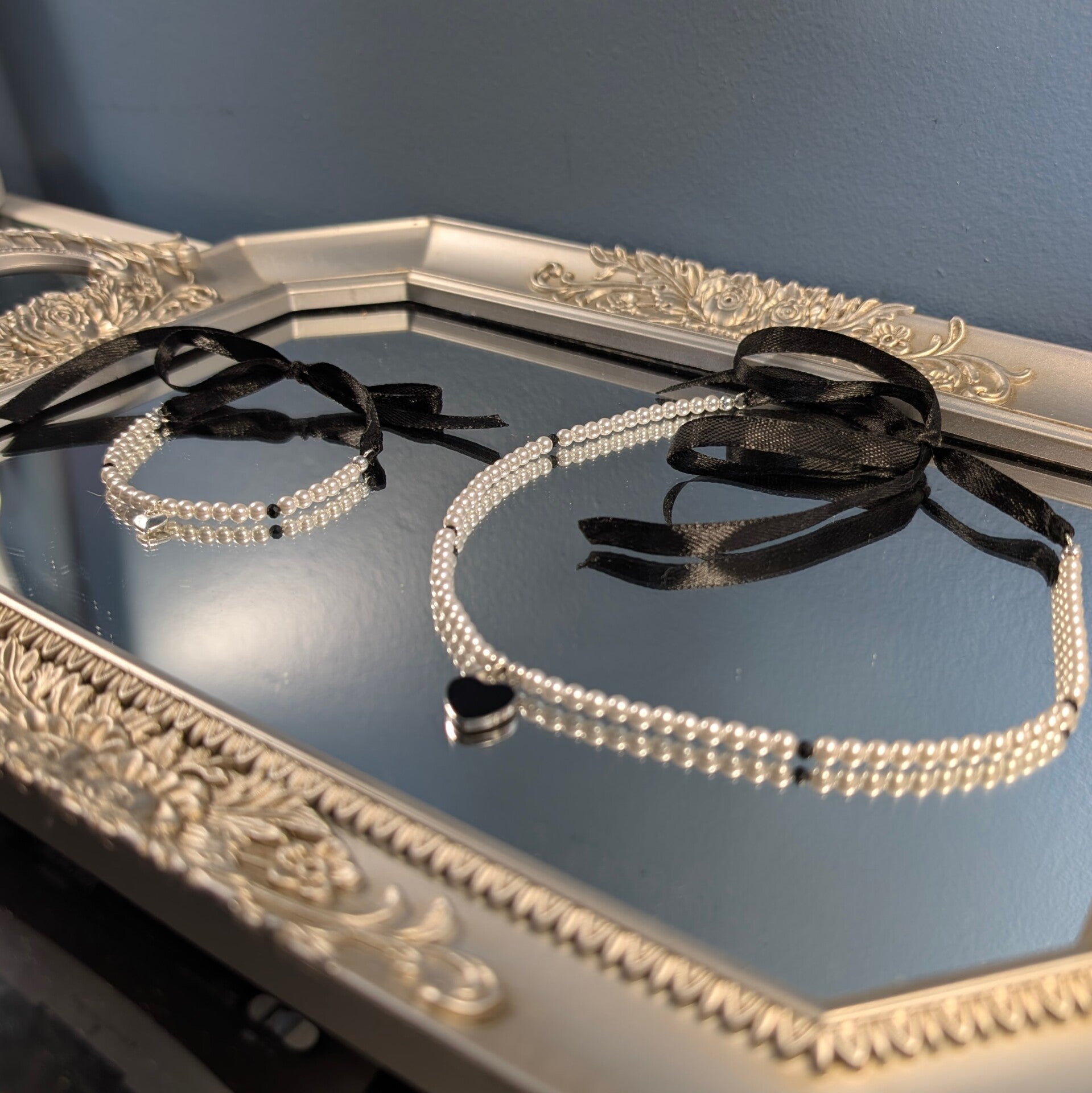 Shell pearls, black faceted spinel beads, with heart charms and a black lace